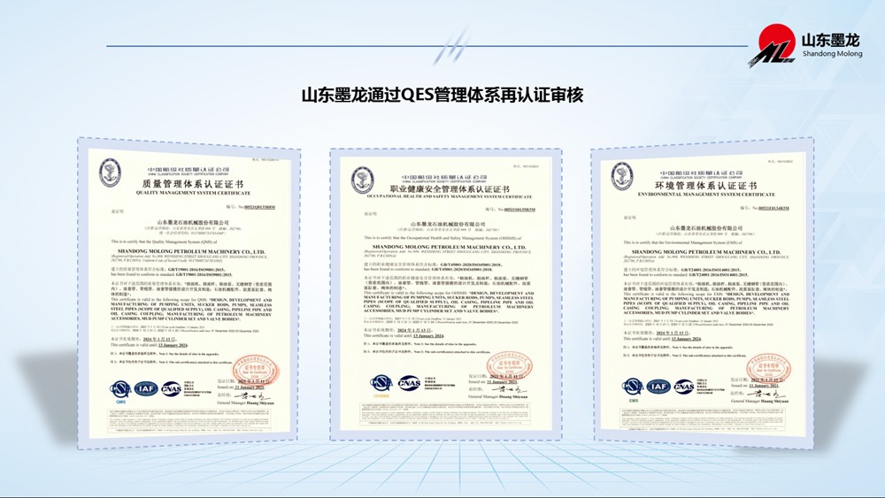 近日,中國船級(jí)社質(zhì)量認(rèn)證公司(以下簡稱“中國船級(jí)社”)完成對(duì)山東墨龍及相關(guān)下屬子公司的QES管理體系(質(zhì)量管理體系、環(huán)境管理體系和職業(yè)健康安全管理體系)再認(rèn)證審核工作。中國船級(jí)社認(rèn)證工作組通過現(xiàn)場審核,確認(rèn)山東墨龍?jiān)俅潍@得認(rèn)證註冊資格,並頒發(fā)認(rèn)證證書,證書有效期為三年。